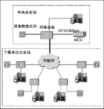 各節(jié)點(diǎn)的接入采用一條512Kbps帶寬的DDN/E1線路接入本地電信公司;在總部采用集中式接入中央電信公司,接入中心的電路帶寬應(yīng)該是多條信道捆綁的帶寬,中心節(jié)點(diǎn)交換機(jī)采用10/100Mbps與MCU相連,總部主會(huì)場(chǎng)的視頻終端通過(guò)接入交換機(jī)與MCU進(jìn)行通信。