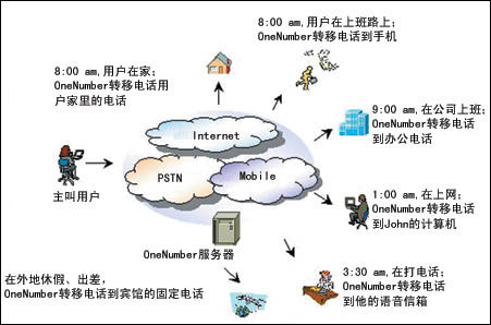 通過OneNumber這一業(yè)務(wù)系統(tǒng),電信運(yùn)營(yíng)商可以整合用戶的各種號(hào)碼資源,有效留住客戶;用戶只需申請(qǐng)一個(gè)OneNumber號(hào)碼,無論用戶走到哪里,主叫用戶都可以通過電話、手機(jī)、PC等方式撥打該號(hào)碼聯(lián)系到用戶。用戶接受信息的手段可以根據(jù)自己的設(shè)定,以電話、手機(jī)、短信、PC等方式與主叫用戶建立聯(lián)系,也可以語音信箱的方式收聽留言。