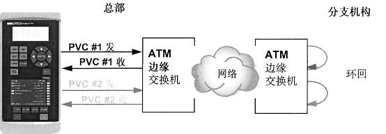 第二,在PVC通道的遠(yuǎn)端設(shè)置物理或虛環(huán)路,這樣單獨(dú)一臺(tái)測(cè)試儀可同時(shí)作為流量的發(fā)送者和接收者(見圖2)。 圖2、環(huán)回測(cè)試設(shè)置,涉及中心局和遠(yuǎn)端局的PVCs端口