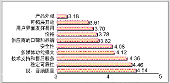 用戶重要性評價(jià)較高4≤Y<4.5的指標(biāo)主要有:穩(wěn)定可靠性、技術(shù)支持和售后服務(wù)、多媒體功能強(qiáng)大、安全性四項(xiàng)。由于視頻會(huì)議系統(tǒng)提供的是實(shí)時(shí)視音頻交互通訊,系統(tǒng)的任何不穩(wěn)定都會(huì)在圖像和聲音上表現(xiàn)出來,因此穩(wěn)定可靠性對視頻會(huì)議系統(tǒng)來說是至關(guān)重要的。