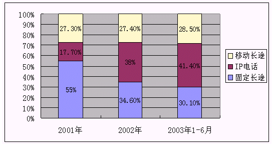 從圖上看,移動(dòng)長(zhǎng)途占整個(gè)長(zhǎng)途通話比重增長(zhǎng)緩慢,IP長(zhǎng)途所占比重上升較快,已由2001、2002年的17.7%、38%上升到41.4%,與此相反,傳統(tǒng)固定長(zhǎng)途所占比重下降較快,由2001年占整個(gè)長(zhǎng)途通話的55%,迅速下降到目前的30.1%。隨著移動(dòng)長(zhǎng)途、IP長(zhǎng)話的異質(zhì)競(jìng)爭(zhēng)加劇,大量分流了傳統(tǒng)固定長(zhǎng)途,2003年1-6月傳統(tǒng)固定長(zhǎng)途中國內(nèi)長(zhǎng)途、國際及港澳臺(tái)通話時(shí)長(zhǎng)比上年同期分別下降0.6%、6.4%、13.9%。