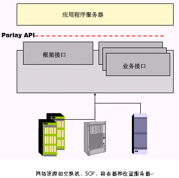 Parlay/OSA設想應用程序運行在應用服務器上,通過TCP/IP連到Parlay/OSA網(wǎng)關(guān)。