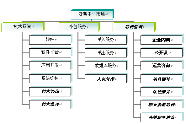 ·從專業(yè)來講,市場將分為客服人員技巧和素質(zhì)培訓、管理人員培訓、呼入運營管理咨詢、電話營銷管理咨詢、技術(shù)咨詢、客服戰(zhàn)略咨詢等不同層面、不同對象的專業(yè)。市場將出現(xiàn)兩類公司,一類是綜合各個專業(yè)、提供一體化解決方案的公司,另一類是以某個專業(yè)為主營業(yè)務(wù)的公司,如電話營銷技巧專業(yè)培訓。