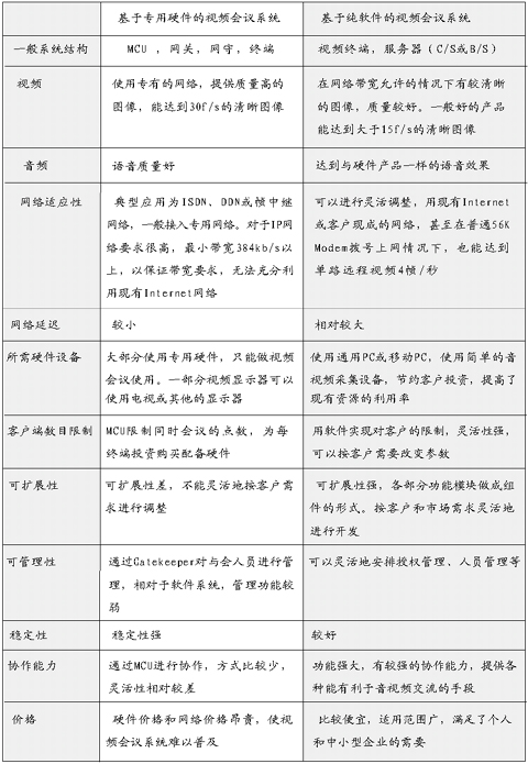 純軟件的視頻會議系統產品大部分是按自己的體系結構基于IP網絡開發(fā)的。這種軟件系統按C/S或C/W模式,基本上由Client端、Server端和網絡傳輸三部分組成。其中部分軟件產品中是按照H.323標準實現其部分模塊,如網關、MCU、Gatekeeper軟件。近幾年,軟件實現的視頻會議系統在市場上出現得越來越多,市場上的軟件視頻會議產品有威速、東大秦皇島軟件的Vmeeting系統、山大聯潤視頻會議系統,以及龍軟基業(yè)的AC Meeting等,以下是基于軟件的視頻會議系統與基于硬件的視頻會議系統的比較。