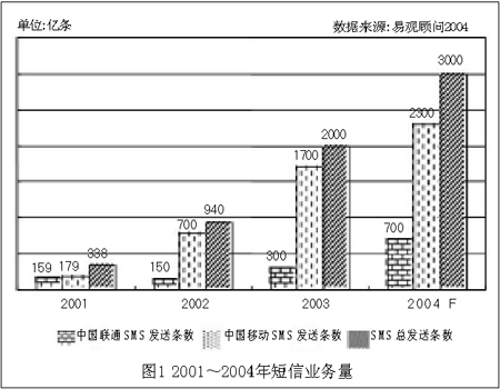 預(yù)計2004年的短信發(fā)送量將達到3000億條,其中中國移動為2300億條,中國聯(lián)通為700億條,具體如圖1所示。并且,隨著用戶逐漸習慣使用SMS業(yè)務(wù),SMS用戶數(shù)占手機用戶數(shù)的比例會略有增加。