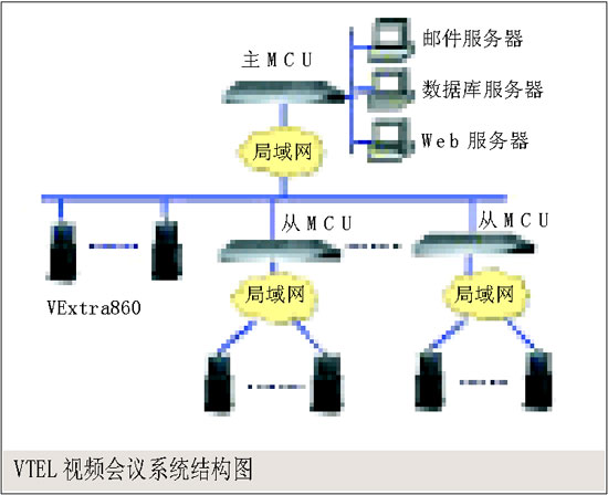 。。網(wǎng)絡拓撲圖如右下圖所示,在中心會場配置的VTEL的Meta 5000 MCU,不僅可以直接接入兩路本地主會場的視頻、音頻,還可以接入分會場的獨立會議電視終端。同時,還能接入要級聯(lián)的Meta