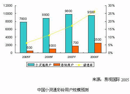 亞太領(lǐng)先的高科技智囊機構(gòu)-易觀國際最新推出的《固網(wǎng)增值業(yè)務(wù)研究系列報告-彩鈴彩話2005》中,易觀預(yù)測,2005年國內(nèi)小靈通彩鈴用戶總數(shù)將達(dá)到500萬戶,市場規(guī)模為1.7億元人民幣;到2008年,小靈通彩鈴用戶有望達(dá)到2,500萬戶,市場規(guī)模將超過21億元人民幣。
