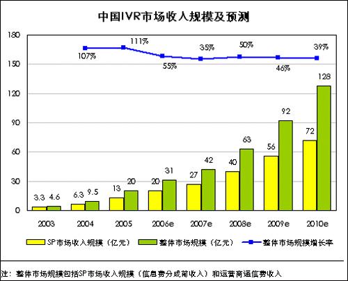 iResearch通過(guò)研究分析,2005年中國(guó)IVR市場(chǎng)總體收入規(guī)模(包括通信費(fèi)及信息費(fèi))為20億元,2006年將達(dá)到31億元,預(yù)計(jì)到2010年將達(dá)到128億元,市場(chǎng)增長(zhǎng)率將呈現(xiàn)逐步下降的趨勢(shì)。其中IVR市場(chǎng)中SP的收入規(guī)模在2005年為13億元,2006年將達(dá)到20億元。