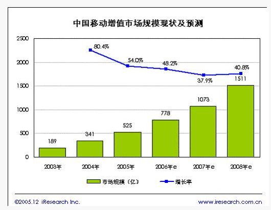 隨著中國移動電話用戶的不斷增長和移動增值服務的不斷發(fā)展創(chuàng)新,移動增值服務已經(jīng)成為現(xiàn)隨著市場的發(fā)展和不斷規(guī)范,中國移動增值服務市場將進入相對平穩(wěn)的發(fā)展階段。據(jù)iResearch預測,中國移動增值服務的市場規(guī)模增長速度將逐年減緩,到2008年受奧運會影響增長速度提高,規(guī)模將突破1500億元。