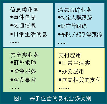 總的來(lái)講,基于位置信息的業(yè)務(wù)和應(yīng)用大體上可分為基本信息類業(yè)務(wù)、追蹤/導(dǎo)航類信息業(yè)務(wù)、安全類信息業(yè)務(wù)和與金融相關(guān)的支付類業(yè)務(wù), 如圖1所示。