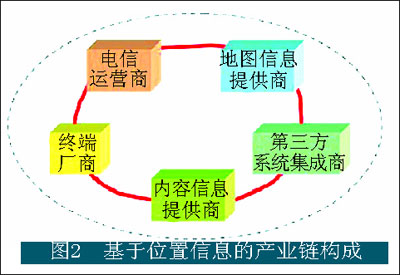 ,卻沒有一種業(yè)務(wù)被廣大人群使用。這是由于基于位置信息的業(yè)務(wù)需要取得大量的應(yīng)用層面相關(guān)的信息,進(jìn)而形成有特色的應(yīng)用。基于位置信息的業(yè)務(wù)和應(yīng)用涉及的角色比較多,所以為了有效地開展這類業(yè)務(wù),必須清晰地認(rèn)識(shí)其價(jià)值鏈的構(gòu)成,只有這樣,運(yùn)營(yíng)商才能有一個(gè)清晰的定位,內(nèi)容開發(fā)和提供商才能獲得事半功倍的結(jié)果,價(jià)值鏈才能健康地發(fā)展和成長(zhǎng)。從業(yè)務(wù)提供的角度,在基于位置信息的業(yè)務(wù)環(huán)境中其產(chǎn)業(yè)鏈的組成如圖2所示。