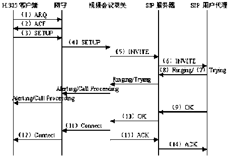 為了更好的說明視頻會議網(wǎng)關在跨協(xié)議會議系統(tǒng)中的作用和工作流程,我們以一個由H.323客戶終端發(fā)起的會議請求為例來描述視頻會議網(wǎng)關對兩種協(xié)議信令消息的處理過程(如圖2所示)。