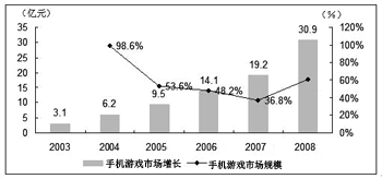 國內(nèi)手機(jī)游戲市場(chǎng)在過去的幾年里呈現(xiàn)快速發(fā)展的趨勢(shì)。2004年增長率接近100%,2005年也有50%以上的增長。但最近兩年國內(nèi)整個(gè)手機(jī)游戲市場(chǎng)隨著手機(jī)普及率的增速放緩也進(jìn)入了盤整期。iResearch咨詢估計(jì),從2005年至2007年,國內(nèi)手機(jī)游戲市場(chǎng)的收入規(guī)模盡管仍然處于上漲趨勢(shì),但年增長率逐年下降,2008年后隨著市場(chǎng)環(huán)境更加成熟理性,年增長率將會(huì)出現(xiàn)反彈,升至60%以上。
