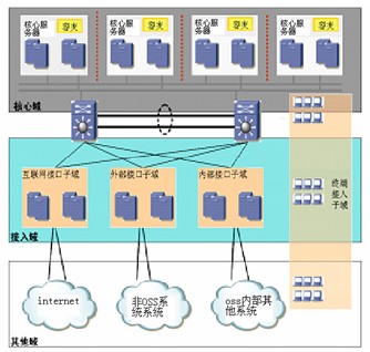 OSS管理者在保證及時(shí)準(zhǔn)確的提供信息服務(wù)的基礎(chǔ)上,應(yīng)該按不同的安全級(jí)別研究對(duì)安全域進(jìn)行劃分,確認(rèn)那些為核心子域,那些為接入域,那些為其他域。通過(guò)對(duì)不同的安全域進(jìn)行不同的安全策略劃分,保證如上的安全域所享受的安全級(jí)別是不同的。圖1顯示,核心域、接入域和其他域是第次接入的,向下訪問(wèn)可以透明傳輸,而向上的訪問(wèn)就必須設(shè)定相應(yīng)的訪問(wèn)控制。