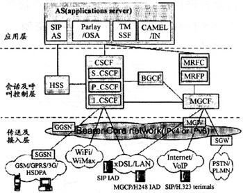 一般IMS分為三層,應(yīng)用層支持各類(lèi)應(yīng)用服務(wù)器,負(fù)責(zé)為用戶(hù)提供增值業(yè)務(wù)和第三方業(yè)務(wù)。會(huì)話(huà)及呼叫控制層負(fù)責(zé)管理呼叫或會(huì)話(huà)設(shè)置,其中呼叫會(huì)話(huà)控制模塊CSCF完成呼叫網(wǎng)關(guān)功能、呼叫業(yè)務(wù)觸發(fā)功能和路由選擇功能,將SIP信令消息正確地轉(zhuǎn)發(fā)到應(yīng)用服務(wù)器。歸屬用戶(hù)服務(wù)器HSS用于維護(hù)每個(gè)終端用戶(hù)獨(dú)有的業(yè)務(wù)屬性,包括IP地址、漫游信息、好友列表、呼叫業(yè)務(wù)定制信息及語(yǔ)音郵件設(shè)置等。HSS是全網(wǎng)可用資源。媒體資源功能MRF包括MRFP和MRFC,負(fù)責(zé)提供及控制媒體流資源,如播放通知音、媒體流的混合、編解碼等。媒體網(wǎng)關(guān)控制MGCF負(fù)責(zé)PSTN承載與IP流之間的連接,根據(jù)被叫號(hào)碼和來(lái)話(huà)情況選擇CSCF,并完成PSTN與IMS之間的呼叫控制協(xié)議轉(zhuǎn)換,如將從CSCF接收到的SIP消息轉(zhuǎn)換為MEGACO或ISUP消息,并通過(guò)IP發(fā)送到信令網(wǎng)關(guān)SGW。出口網(wǎng)關(guān)控制功能BGCF主要實(shí)現(xiàn)呼叫路由功能,為呼叫選擇適當(dāng)?shù)腜STN接口點(diǎn),若發(fā)現(xiàn)該接口點(diǎn)與自己在同一網(wǎng)絡(luò),則選擇本網(wǎng)絡(luò)的MGCF與PSTN交互,若發(fā)現(xiàn)接口點(diǎn)在另一網(wǎng)絡(luò)時(shí),BGCF將會(huì)話(huà)信令轉(zhuǎn)發(fā)給另一網(wǎng)絡(luò)相應(yīng)的BGCF。一個(gè)IMS可以包含一個(gè)或多個(gè)CSCF、HSS、MGCF等功能模塊。傳送及接入層承載各種類(lèi)型之間的轉(zhuǎn)換,完成與傳統(tǒng)PSTN/PLMN間的互通等功能,包括各類(lèi)有線接入、無(wú)線接入、互聯(lián)互通網(wǎng)關(guān)等設(shè)備。