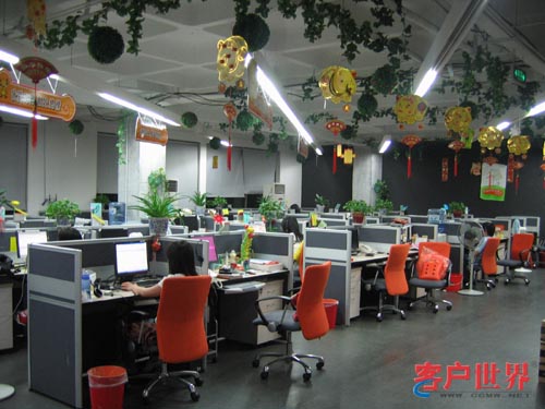 整個(gè)服務(wù)現(xiàn)場(chǎng)的裝修以桔黃色為主色調(diào),代表溫暖、和諧;格局不規(guī)則化,盡顯現(xiàn)代時(shí)尚的風(fēng)格;辦公室到處是綠色植物,墻上貼滿了各種相片、海報(bào)和宣傳語(yǔ),天花板掛滿了激勵(lì)口號(hào)板;別具特色的洗手間文化;乒乓球室、休息室、休閑吧,咖啡機(jī)、茶葉、果汁、雪糕、飲料,魚(yú)缸、大液晶電視、音響……一點(diǎn)感覺(jué)不到這是一個(gè)枯燥的呼叫中心的工作環(huán)境。