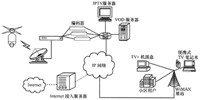 。。WiMAX網(wǎng)絡(luò)支持豐富多彩的業(yè)務(wù)模式。不同速率的數(shù)據(jù)業(yè)務(wù)是網(wǎng)絡(luò)的主要承載目標(biāo)。WiMAX支持不同的QoS級(jí)別,因此網(wǎng)絡(luò)覆蓋范圍與業(yè)務(wù)類型緊密相關(guān)。在IPTV的接入方面,由于IPTV需要高級(jí)別的QoS保證以及高速的數(shù)據(jù)傳輸速率,所以根據(jù)小區(qū)內(nèi)用戶的數(shù)量以及需求,合理設(shè)置WiMAX網(wǎng)絡(luò)。用戶接入IPTV網(wǎng)絡(luò)的時(shí)候。不需要再次進(jìn)行布線,只需加裝WiMAX接收設(shè)備和IP機(jī)頂盒即可,因此用戶可以方便、快捷地使用IPTV業(yè)務(wù)。WiMAX實(shí)現(xiàn)IPTV的接入如圖1所示。