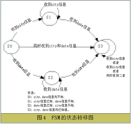 在總結(jié)了前人工作經(jīng)驗和結(jié)合本系統(tǒng)的實際問題的基礎(chǔ)上,我們在對話管理的具體實現(xiàn)上,將框架理論和有限狀態(tài)自動機(jī)理論相結(jié)合,完成了一個智能的對話管理模塊。我們先將對話管理限制在天氣查詢領(lǐng)域。在系統(tǒng)中,通過人機(jī)之間的對話和確認(rèn),系統(tǒng)需要得到要查詢的時間和地點信息之后反饋查詢結(jié)果。