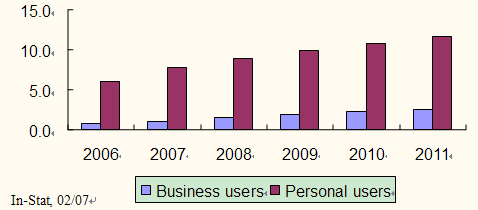In-Stat預計,到2011年中國手機電子郵件用戶達到1400萬戶,其中企業(yè)用戶達到250萬,個人用戶達到1170萬。2007到2011年,企業(yè)用戶年均復合增長率為24.8%,個人用戶年均復合增長率為10.6%。如下圖所示: