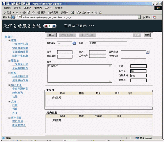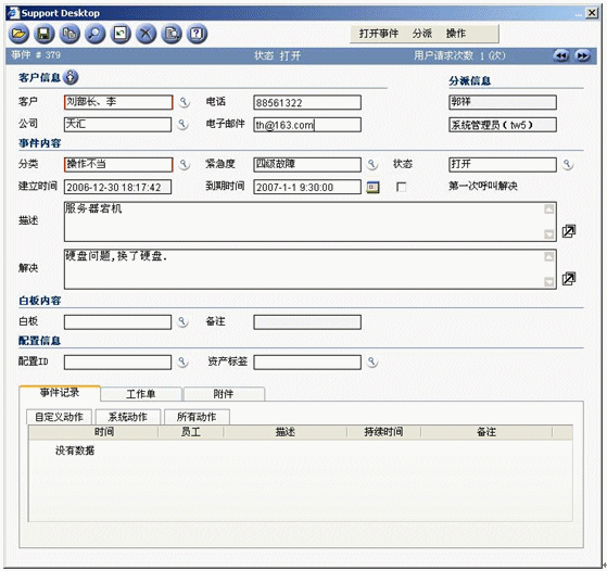 事件記錄應(yīng)該在某個(gè)服務(wù)臺(tái)工具中記錄和跟蹤,該工具最好是作為集成的服務(wù)管理工具集的構(gòu)成部分。該工具應(yīng)該在引發(fā)新的事件時(shí)提供最基本的事件記錄。比如為了幫助提高效率,當(dāng)你在天匯幫助臺(tái)的用于記錄事件的事件窗口中輸入請(qǐng)求發(fā)起者的姓名時(shí),利用客戶數(shù)據(jù)庫(kù)可以自動(dòng)填充諸如位置、部門(mén)和聯(lián)系詳細(xì)信息等字段。天匯幫助臺(tái)還支持使用計(jì)算機(jī)電話集成