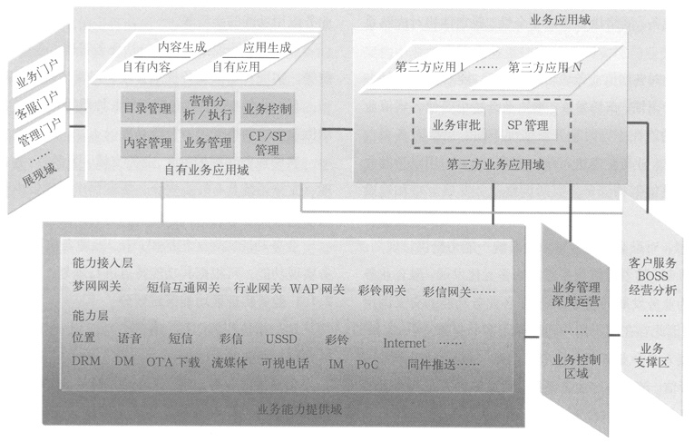 (1)業(yè)務(wù)能力系統(tǒng)。該部分包括具有實(shí)現(xiàn)各應(yīng)用功能的能力提供系統(tǒng),如短信、WAP等,可提供用戶使用業(yè)務(wù)功能的實(shí)現(xiàn)通道。