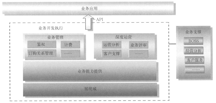 根據(jù)移動(dòng)增值業(yè)務(wù)特征及業(yè)務(wù)部署、管理需求,目標(biāo)網(wǎng)絡(luò)架構(gòu)中將實(shí)現(xiàn)業(yè)務(wù)與控制的分離,劃分業(yè)務(wù)控制域和業(yè)務(wù)開(kāi)發(fā)執(zhí)行域,并可開(kāi)放公共接口實(shí)現(xiàn)各增值業(yè)務(wù)應(yīng)用無(wú)差別的接入、管理及功能調(diào)用,以方便的實(shí)現(xiàn)業(yè)務(wù)的融合、業(yè)務(wù)功能的靈活組合,更利于高效、簡(jiǎn)便的實(shí)現(xiàn)業(yè)務(wù)部署、開(kāi)發(fā)及運(yùn)營(yíng)。
