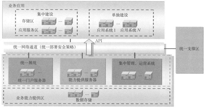 (6)統(tǒng)一展示區(qū):搭建統(tǒng)一門(mén)戶,并采用用戶信息統(tǒng)一管理,用戶登陸一次鑒權(quán)機(jī)制,以提供用戶多業(yè)務(wù)統(tǒng)一登陸通道,及一次登陸方式,實(shí)現(xiàn)業(yè)務(wù)統(tǒng)一展示、管理,減小多業(yè)務(wù)給用戶帶來(lái)的感知度。各區(qū)域可分別構(gòu)造統(tǒng)一數(shù)據(jù)存儲(chǔ)系統(tǒng)和統(tǒng)一應(yīng)用系統(tǒng),具體建設(shè)時(shí)可在物理位置上統(tǒng)一部署。