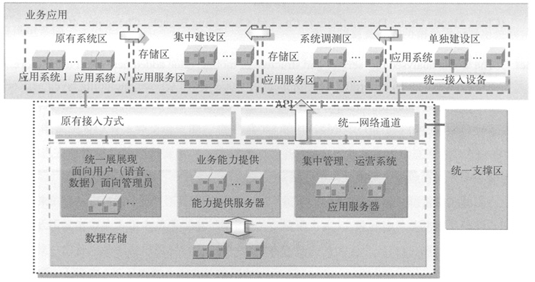 。1)業(yè)務(wù)能力提供區(qū)。由于系統(tǒng)架構(gòu)已搭建完畢,且存在不同系統(tǒng)對(duì)硬件平臺(tái)個(gè)體化需求,如一些業(yè)務(wù)系統(tǒng)僅支持承載在特定操作系統(tǒng),若采用物理整合方式對(duì)系統(tǒng)改動(dòng)大,改造難度大,綜合考慮系統(tǒng)穩(wěn)定性、實(shí)現(xiàn)難度、投資金額、實(shí)施效果等因素,該部分可采用邏輯整合方式,其中: