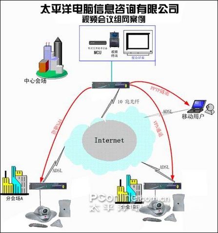 該方案有很強的針對性,作為主會場必須用10兆/20兆光纖接入INTERNET,且需要視頻交換處理設(shè)備MCU,而太平洋電腦網(wǎng)本身就具備雄厚的服務(wù)器作為基礎(chǔ)。廣州總公司還需要較高配置的視頻終端設(shè)備,在局域網(wǎng)網(wǎng)關(guān)上安裝較高配置路由器,主會場可以通過設(shè)置MCU隨時使某一分會場成為主席。