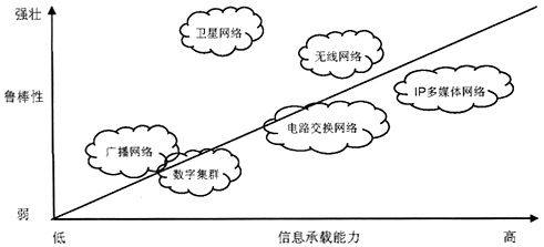 圖2 各種通信網絡的魯棒性和信息承載能力分析