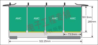 為了提高ATCA設(shè)計(jì)的模塊化性能,PICMG開發(fā)了高級夾層卡(AMC)規(guī)范。在ATVA卡上放置這些模塊后就可以使它們訪問背板連接,因此這些模塊可以用來定制ATCA卡上的I/O,并用來裝載處理器和存儲(chǔ)外設(shè)。一塊ATCA卡最多能夠放4個(gè)AMC模塊(見圖1),因此設(shè)計(jì)師用一個(gè)卡即可實(shí)現(xiàn)多種不同的配置。就像ATCA卡一樣,AMC模塊同樣可以實(shí)現(xiàn)單個(gè)模塊的遠(yuǎn)程系統(tǒng)管理和熱交換功能。