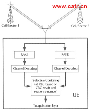 當(dāng)終端用戶(hù)移動(dòng)到不同基站下的小區(qū)分界處時(shí)候,采用宏分集技術(shù)同時(shí)接收來(lái)自?xún)蓚(gè)基站的電視數(shù)據(jù)(見(jiàn)圖3)。在實(shí)現(xiàn)宏分集技術(shù)時(shí),要求網(wǎng)絡(luò)側(cè)針對(duì)同一MBMS業(yè)務(wù)在兩小區(qū)間進(jìn)行內(nèi)容同步和一定程度上的時(shí)間同步。