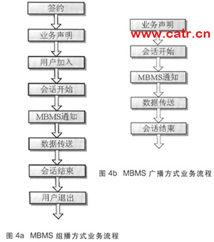 MBMS可應(yīng)用組播模式和廣播模式兩種業(yè)務(wù)模式。廣播模式接近于數(shù)字電視業(yè)務(wù),而組播模式專(zhuān)注和定位于群業(yè)務(wù)。組播模式提供了更好的計(jì)費(fèi)特性,包括服務(wù)訂閱、接入和推出功能,需要用戶(hù)簽約相應(yīng)組播組,進(jìn)行業(yè)務(wù)激活,并產(chǎn)生相應(yīng)的計(jì)費(fèi)信息,而廣播業(yè)務(wù)不需要小區(qū)中所有用戶(hù)都制定該業(yè)務(wù)便可以獲得。由于組播和廣播模式在業(yè)務(wù)需求上存在不同,導(dǎo)致其業(yè)務(wù)流程也不同(見(jiàn)圖4a、圖4b)。