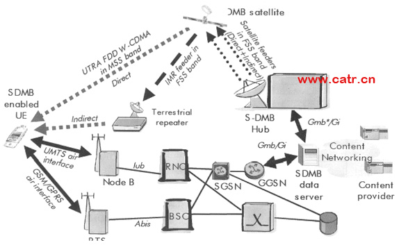 S-DMB可看作在專(zhuān)用頻段MSS(2170~2200MHz)上提供廣播能力的MBMS技術(shù)。由于MSS頻段緊靠IMT2000下行核心頻段(2110~2170MHz),這對(duì)終端的成本及地面直放站的部署都極為有利。因此,S-DMB可以看作為MBMS的擴(kuò)展(也可以稱(chēng)為S-MBMS),它與MBMS同屬于一個(gè)規(guī)范體系。S-DMB最大程度地重用UMTS的技術(shù)包括擴(kuò)頻通信,調(diào)制方式等,同時(shí)增加IMR(Intermediate Module Repeater)滿(mǎn)足室內(nèi)覆蓋的要求,并且可以依靠UMTS終端強(qiáng)大的宏分集能力,支持從衛(wèi)星的覆蓋范圍到地面直放站覆蓋范圍的切換,以及在兩個(gè)不同地面直放站覆蓋范圍的切換。