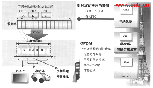 ISDB-T使用具有13個(gè)OFDM子波段的分段波段,將整個(gè)6MHz頻帶劃分為13個(gè)子帶,每個(gè)子帶432kHz,進(jìn)行分段傳輸(Bandwidth Segemented Transmission-BST),對(duì)不同的BST采用不同編碼類(lèi)型和調(diào)制映射方式(QPSK或QAM等),以滿(mǎn)足不同業(yè)務(wù)的需求,如對(duì)傳輸多媒體文本文件對(duì)信道編碼的技術(shù)要求較低,而對(duì)移動(dòng)視頻接收等要求則較高。由于ISDB-T采用載波分割的技術(shù),因此終端可以進(jìn)行窄帶接收,從而有效地降低了終端功耗。