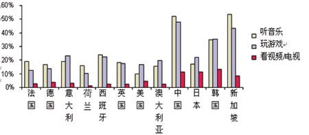 除打電話、發(fā)短信、拍照、手機郵箱以外,音樂、游戲也是用戶每周使用較多的業(yè)務(wù)。當(dāng)被問及其它應(yīng)用時,來自中國、新加坡還有韓國的部分被調(diào)查者表示,他們會經(jīng)常用手機來聽音樂和玩游戲。其中,中國是惟一一個選擇用手機聽音樂的用戶數(shù)與選擇用手機拍照的用戶數(shù)旗鼓相當(dāng)?shù)膰。但有趣的是,手機在中國不太可能成為MP3的替代品,仍然只是一個便攜播放器。在新加坡,手機替代MP3的可能性就大多了。Ovum認為,這是由于高端手機在新加坡市場占有很高的比例。在歐洲和美國,使用手機來聽音樂和玩游戲的比例則比亞洲少了很多,但值得鼓勵的是仍有超過10%的被調(diào)查者選擇了該答案。(見圖2)