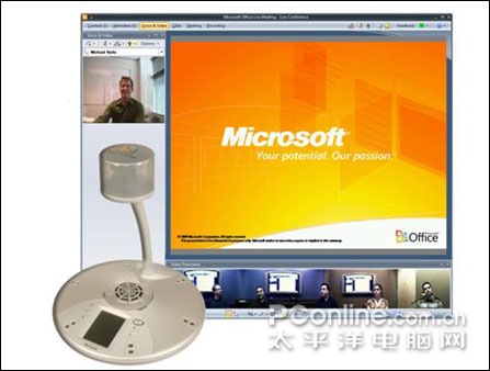 微軟Office RoundTable,音頻-視頻協(xié)作設(shè)備,帶有一個(gè)獨(dú)特的 360 度相機(jī)。在結(jié)合 Office Communications Server 2007 使用時(shí),RoundTable 還可交付卓越的會(huì)議體驗(yàn):將會(huì)議環(huán)境擴(kuò)展到多個(gè)位置。現(xiàn)場(chǎng)及遠(yuǎn)程位置的與會(huì)人員可以全景查看會(huì)議室中的每位成員,還可以在輪流發(fā)言時(shí)拉近特寫(xiě)某個(gè)與會(huì)者。