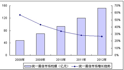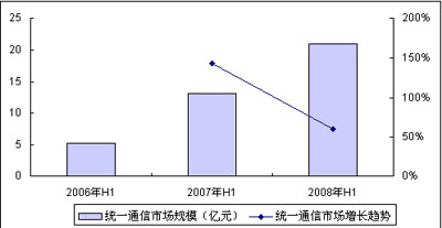 統(tǒng)一通信作為一種以融合技術(shù)為基本特征的特定解決方案和應(yīng)用,通過對(duì)各種溝通方式進(jìn)行有效的融合,滿足用戶方便快捷的信息獲取和溝通需求,近年來在全球范圍內(nèi)得到了迅猛發(fā)展,各大通信與信息技術(shù)相關(guān)廠商紛紛加入統(tǒng)一通信市場(chǎng)的競(jìng)爭中。賽迪顧問數(shù)據(jù)統(tǒng)計(jì)顯示,2008年上半年,中國統(tǒng)一通信整體市場(chǎng)規(guī)模已達(dá)到21.01億元,同比增長超過60.9%,繼續(xù)保持強(qiáng)勁的增長勢(shì)頭。