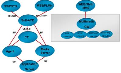 目前市場(chǎng)最常見(jiàn)的第三代呼叫中心是傳統(tǒng)的基于TDM的呼叫中心,應(yīng)用了計(jì)算機(jī)電話集成(CTI)技術(shù)。隨著網(wǎng)絡(luò)的普及和NGN的發(fā)展,出現(xiàn)第五代呼叫中心NGCC。NGCC是以NGN為基礎(chǔ)構(gòu)建的呼叫中心系統(tǒng),核心控制設(shè)備處理呼叫的能力較傳統(tǒng)呼叫中心大幅提高。NGCC的網(wǎng)絡(luò)架構(gòu)和接口如圖3所示。