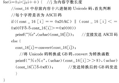 經(jīng)研究比較發(fā)現(xiàn),所要提取的短信信息包括手機(jī)號碼、時(shí)間和短信內(nèi)容。在Text模式下時(shí)間和日期均為ASCII碼,可直接讀取,只需將內(nèi)容中漢字部分的Unicode碼轉(zhuǎn)換成國標(biāo)碼;而在PDU模式下除漢字編碼轉(zhuǎn)換外,還需將號碼、時(shí)間部分編碼進(jìn)行兩兩顛倒的轉(zhuǎn)換,才能得到所需的正確信息。故在系統(tǒng)設(shè)計(jì)中將GSM模塊設(shè)為Text模式,更能簡化程序設(shè)計(jì)。