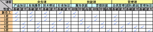 要實(shí)現(xiàn)分層培訓(xùn)管理,除了有適合的培訓(xùn)體系架構(gòu),更重要的還要有一個(gè)比較完善的培訓(xùn)課程體系。我們假設(shè)將這個(gè)呼叫中心分為5個(gè)服務(wù)等級(jí),那么在課程的設(shè)置上,我們就可以按照下表所示的方式來進(jìn)行安排。