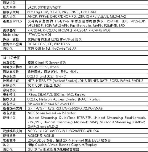 HyperMetrics板卡全面支持L2~L7層應(yīng)用測(cè)試,具備全面的協(xié)議仿真能力,并為不同應(yīng)用提供全面的解決方案,表1列出了Spirent TestCenterTM所支持的L2~L7層協(xié)議細(xì)節(jié)。