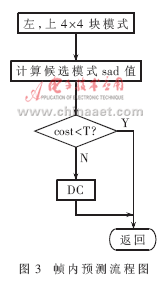 (4)算法替代和改進。幀間預(yù)測的改進:關(guān)于算法的改進主要集中在對me(motion estimation)的改進上,流程如圖2所示。costmin1=min(cost16,cost8,cost16×8,cost8×16),costmin2=min(costmin1,costsub),依次在16×16、8×8、16×8和8×16大小宏塊的整像素位置做預(yù)測,再做次像素估計和幀內(nèi)預(yù)測,選用匹配準則函數(shù)(采用sad作為匹配準則函數(shù))取得最小值的模式進行編碼。每計算一種模式,都將sad值與一個經(jīng)驗閥值做比較。當(dāng)sad值小于這個閥值時,立即結(jié)束運動估計,從而減少運算量。
