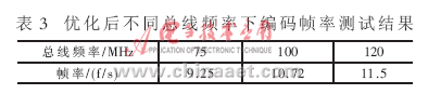 對于不同的總線頻率,優(yōu)化后編碼幀率不同,結(jié)果如表3所示,采用的測試序列為foreman。