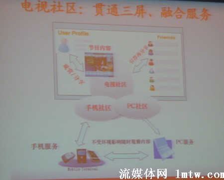 百視通在數(shù)月前便發(fā)布了三屏融合戰(zhàn)略,據(jù)李川介紹,百視通是從節(jié)目分享開始著手的。比如發(fā)一個(gè)片花到手機(jī)上,用戶喜歡的話可以定制,IPTV上設(shè)一個(gè)入口,兩相對(duì)接,用戶點(diǎn)一兩個(gè)鍵就可以很方便的看到他需要的視頻,從而解決了不斷翻頁造成用戶流失的問題。而在電腦上,也可以實(shí)現(xiàn)這樣的定制,甚至是異地傳送。亦即即使出差在外地,也可以很簡(jiǎn)單的通過互聯(lián)網(wǎng)定制IPTV節(jié)目送給家人、朋友。