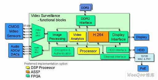 經(jīng)過壓縮后的數(shù)據(jù)通過硬盤驅(qū)動器接口存儲至視頻存儲服務(wù)器,或通過以太網(wǎng)網(wǎng)絡(luò)發(fā)送。視頻數(shù)據(jù)傳送到顯示器之前通常是取自硬盤驅(qū)動器,并經(jīng)過了解碼以及一些圖像后處理,如縮放、色彩空間轉(zhuǎn)換或覆蓋應(yīng)用。通常情況下,存儲器接口(如DDR2)是用來存儲視頻幀。此外,某些系統(tǒng)要求視頻內(nèi)容的實時加密以確保安全和源/用戶身份驗證。最后,需要用處理器控制和協(xié)調(diào)/排定各種不同的任務(wù)。