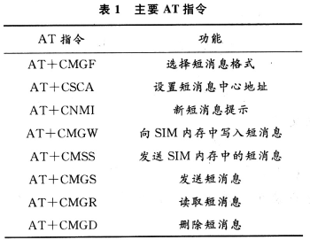 AT即Attention,AT指令集是從終端設(shè)備(Ter-minal Equipment,TE)或數(shù)據(jù)終端設(shè)備(Data Terminal Equipment,DTE)向終端適配器(Terminal Adapter, TA)或數(shù)據(jù)電路終端設(shè)備(Data Circuit Terminal E-quipment,DCE)發(fā)送的。通過(guò)TA,TE發(fā)送AT指令來(lái)控制移動(dòng)臺(tái)(Mobile Station,MS)的功能,與GSM網(wǎng)絡(luò)業(yè)務(wù)進(jìn)行交互。用戶可以通過(guò)AT指令進(jìn)行呼叫、短信、電話本、數(shù)據(jù)業(yè)務(wù)、傳真等方面的控制。主要AT指令如表1所示。