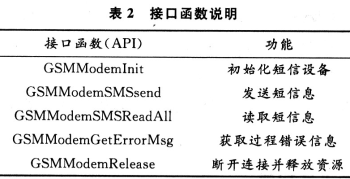 短信貓通過(guò)RS 232串口與計(jì)算機(jī)連接,系統(tǒng)需通過(guò)接口驅(qū)動(dòng)短信貓發(fā)送或讀取短信,各接口函數(shù)說(shuō)明見(jiàn)表2。