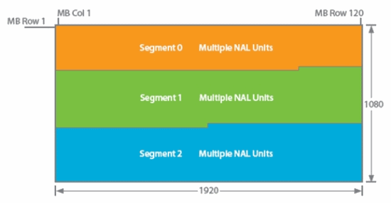 在這種架構(gòu)中,編碼器的實(shí)施分配到多個 DSP 內(nèi)核。每個宏塊條都分配到一個DSP內(nèi)核。其中每個內(nèi)核都提供一些特定功能,如:速率控制與幀內(nèi)圖像處理。事實(shí)上,無法預(yù)先進(jìn)行比特預(yù)算并分配到各個宏塊條,因?yàn)椴煌陦K條可能具有不同的圖像復(fù)雜性,而在圖像分割塊之間采用差異很大的Qp值會造成合成圖像的層邊界出現(xiàn)偽影。在H.264中,宏塊條NAL可以包含任意數(shù)量的宏塊,因此與H.263不同,圖像分割塊的形狀無需符合GOB邊界。每個宏塊條的頭部(slice