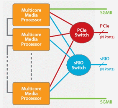 圖3說明,高速串行I/O在復(fù)雜視頻處理任務(wù)中的潛在應(yīng)用。圖中顯示用于擴(kuò)展多個器件中多核器件處理能力的連接方案,其可以實(shí)現(xiàn)更復(fù)雜的視頻處理運(yùn)算或支持更多視頻轉(zhuǎn)碼通道。采用sRIO開關(guān)能夠?qū)崿F(xiàn)更靈活的器件間通信,不過如果處理流處于相鄰器件之間,也可以不采用這種開關(guān)。與PCIe開關(guān)相比,sRIO由于其數(shù)據(jù)包開銷較低,因此一般成本更低、性能更高、且時(shí)延更短。
